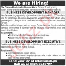 The Chartered Institute of Arbitrators Karachi, karachi Sindh Pakistan invites applications from eligible candidates for the post of business development manager and business development executive as per advertisement of October 1, 2023 published in daily Jang Newspaper. Preferred Education is Master and Bachelor etc.