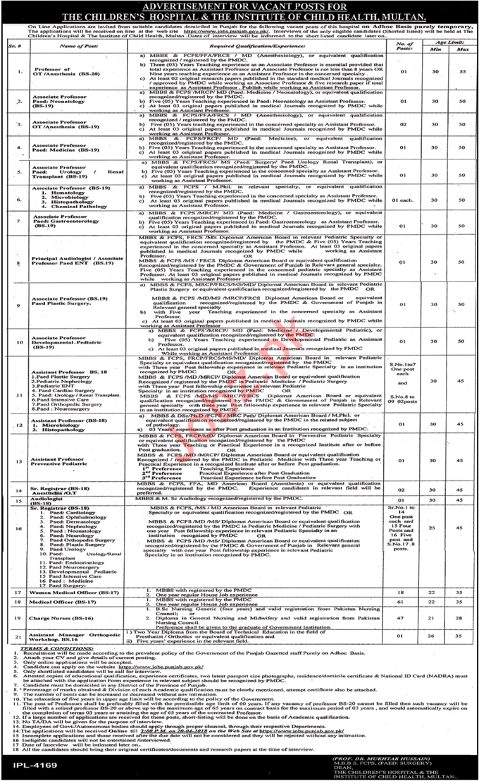 The Children Hospital & The Institute of Child Health Multan is currently looking for medical, health, mbbs, doctors & qualified individuals for the posts of Professor, Associate Professors, Principal, Assistant Professors, Sr Registrar, Medical Officer, Charge Nurse & Assistant Manager.