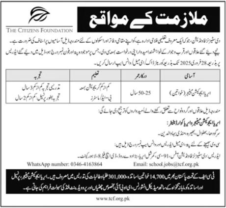 The Citizens Foundation TCF is looking for candidates for following posts as per job advertisement published in daily Jang Newspaper of March 2, 2025 for location Cantt Lahore, lahore Punjab Pakistan: