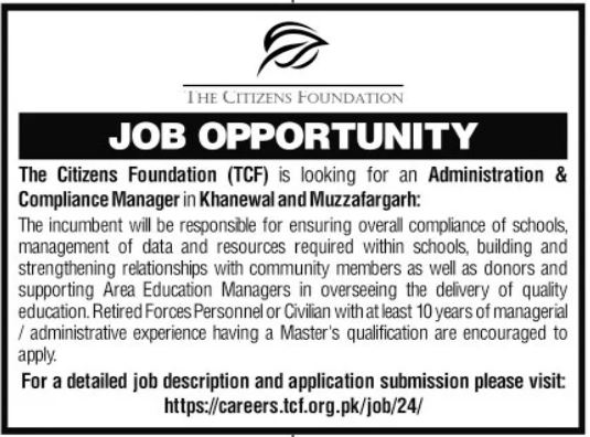 The Citizens Foundation Khanewal Punjab Pakistan invites applications from eligible candidates for the post of admin manager and compliance manager as per advertisement of January 30, 2022 published in daily Jang Newspaper. Preferred Education is Master and Bachelor etc.