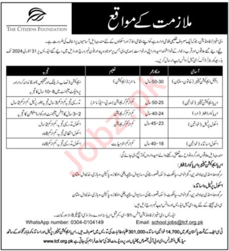 The Citizens Foundation TCF is looking for candidates for following posts as per job advertisement published in daily Jang Newspaper of January 5, 2025 for location Lahore, lahore Punjab Pakistan: