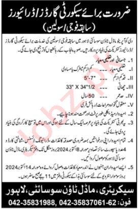 The Cooperative Model Town Society Lahore, lahore Punjab Pakistan invites applications from eligible candidates for the post of security guard and driver as per advertisement of September 29, 2024 published in daily Jang Newspaper. Educational qualifications required Intermediate, Middle and Matric etc.