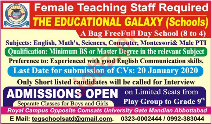 Vacancies in The Educational Galaxy School Advertisement January 2020