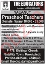 The Educators Rawalpindi, rawalpindi Punjab Pakistan invites applications from eligible candidates for the post of preschool teacher as per advertisement of October 2, 2022 published in daily Jang Newspaper. Educational qualifications required B.ed and BA etc.