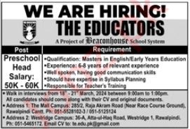 The Educators invites applications for job positions advertised in daily Jang dated 17 March 2024 for following vacancies in Rawalpindi, rawalpindi Punjab Pakistan.