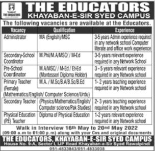 The Educators is looking for candidates for following posts as per job advertisement published in daily Jang Newspaper of May 15, 2022 for location Rawalpindi, rawalpindi Punjab Pakistan: