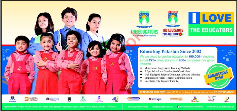 The Educators Multan, Pakistan open admissions session 2018 to 2019 for the classes of Play Group to Class 9. Concordia Colleges offer 50 percentage scholarship to all students of The Educators. Read newspaper ad for exact details.