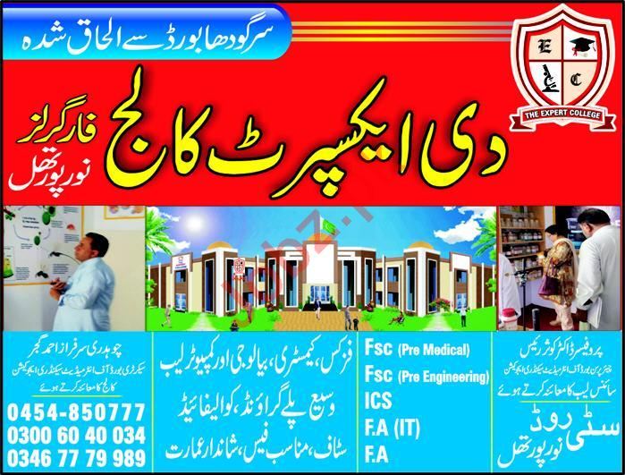 The Expert College is offering admissions in F.Sc Pre Medical, F.Sc Pre Engineering, ICS, F.A IT, F.A in Nurpur Thal, Khushab. The Expert College is affiliated with Sargodha Board. Read newspaper ad for exact details.