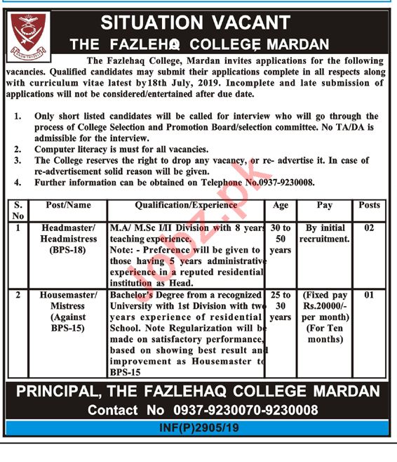 Vacancies in The Fazl e Haq College Advertisement June 2019