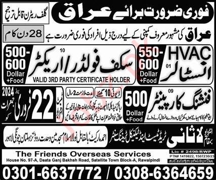 The Friends Overseas Services invites applications for job positions advertised in daily Express dated 18 February 2024 for following vacancies in Baghdad, baghdad Iraq.