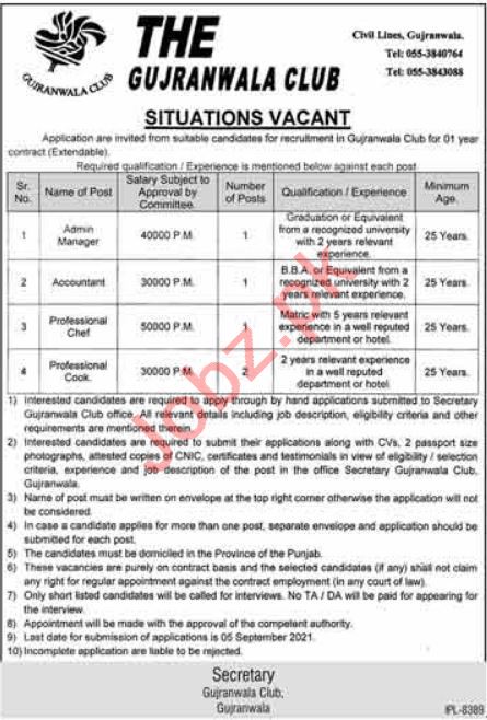 Vacancies in Gujranwala Club Advertisement August 2021