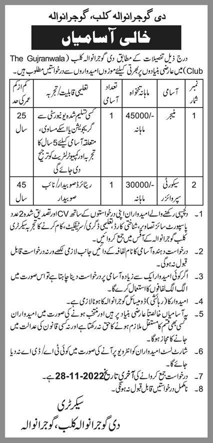 The Gujranwala Club Gujranwala, gujranwala Punjab Pakistan invites applications from eligible candidates for the post of manager and security supervisor as per advertisement of November 19, 2022 published in daily Express Newspaper. Educational qualifications required Bachelor and Matric etc.