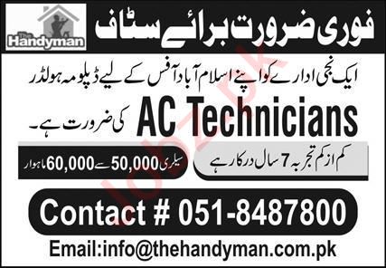 Vacant posts including ac technician are announced in The Handyman Ltd Islamabad, islamabad Islamabad Pakistan as per 28 April 2024 advertisement in daily Express Newspaper. Primary, Matric and Middle etc. educational qualification will be preferred.