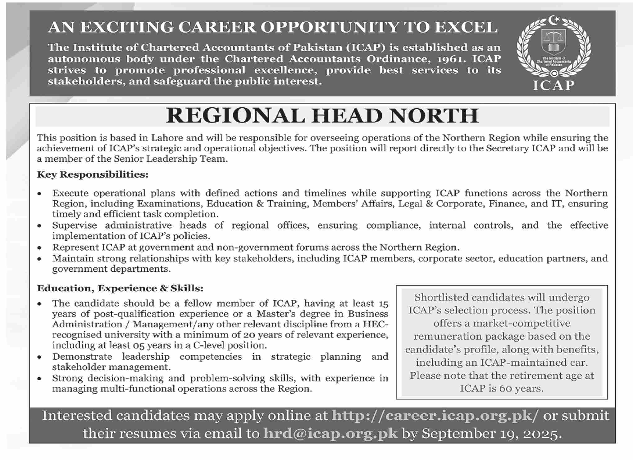 Vacant posts including regional head and regional head north are announced in The Institute of Chartered Accountants of Pakistan PECHS Block 6 Karachi, karachi Sindh Pakistan as per 7 September 2025 advertisement in daily Dawn Newspaper. Master etc. educational qualification will be preferred.