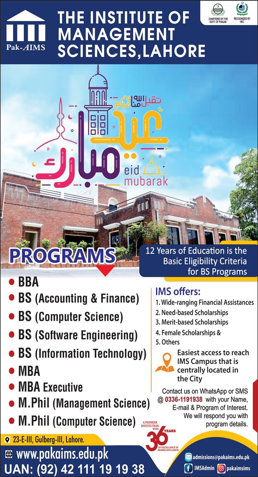 Admissions in The Institute of management sciences 2022 for BBA, BS, MBA, MBA Executive, M Phil has been announced. Students who want to take admissions in The Institute of management sciences Lahore Punjab Pakistan for academic year 2022 to continue education in Teaching University can apply. Students who want to enroll for academic session 2022 in BS, BBA, Mphil and MBA qualification and admission criteria for Private institute can apply till last date 1 June 2022. Read newspaper ad for exact details.
