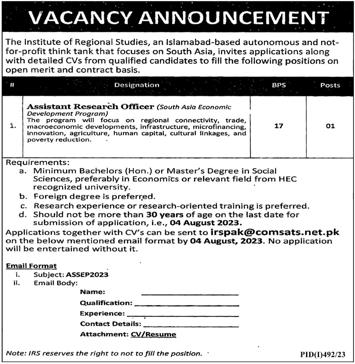 Institute of Regional Studies IRS Islamabad, islamabad Islamabad Pakistan invites applications from eligible candidates for the post of assistant research officer as per advertisement of July 23, 2023 published in daily Express Tribune Newspaper. Preferred Education is Master and Bachelor etc.