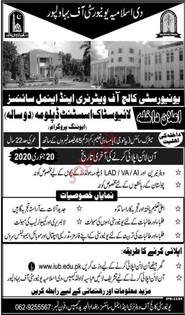 The Islamia University of Bahawalpur, University College of Veterinary & Animal Sciences has announced admissions for session 2020 in Diploma iof Livestock Assistant in Bahawalpur. Read newspaper ad for exact details.