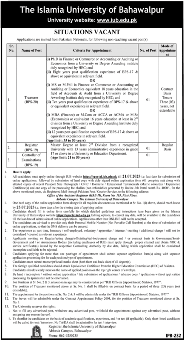Vacant posts including treasurer, controller of examination and registrar are announced in The Islamia University of Bahawalpur Bahawalpur, bahawalpur Punjab Pakistan as per 25 June 2025 advertisement in daily Jang Newspaper. Preferred Education is Mphil, Phd, Master and Bachelor etc.