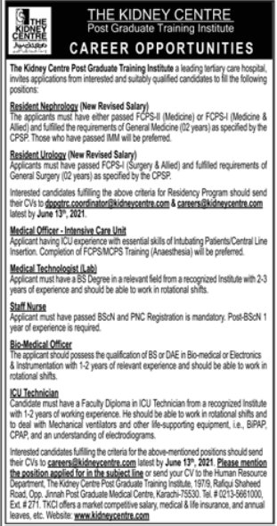 The Kidney Centre Post Graduate Training Institute invites applications from medical, health, mbbs, doctors and experienced candidates for the posts of Resident Nephrology, Resident Urology, Medical Officer, Medical Lab Technologist, Staff Nurse, Biomedical Officer and ICU Technician in Karachi.