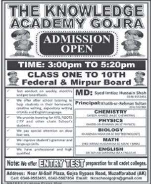The Knowledge Academy Gojra invites applications for admissions in Class I, Class II, Class III, Class IV, Class V, Class VI, Class VII, Class VIII, Class IX and Class X in Muzaffarabad AJK 2021. Read newspaper ad for exact details.