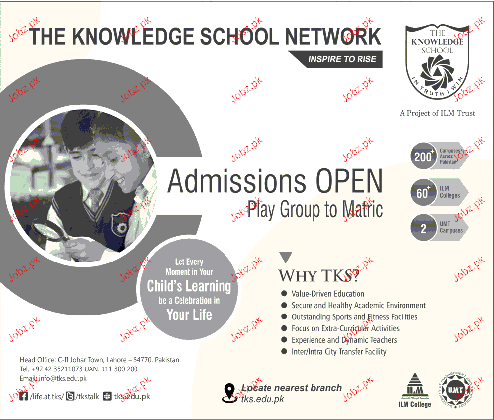 The Knowledge Network Admission in Palygroup to Matric in Lahore. Read newspaper ad for exact details.