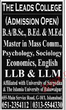 The Leads College Admission in BA, BSc, B.Ed, LLB and LLM in Islamabad Read newspaper ad for exact details.