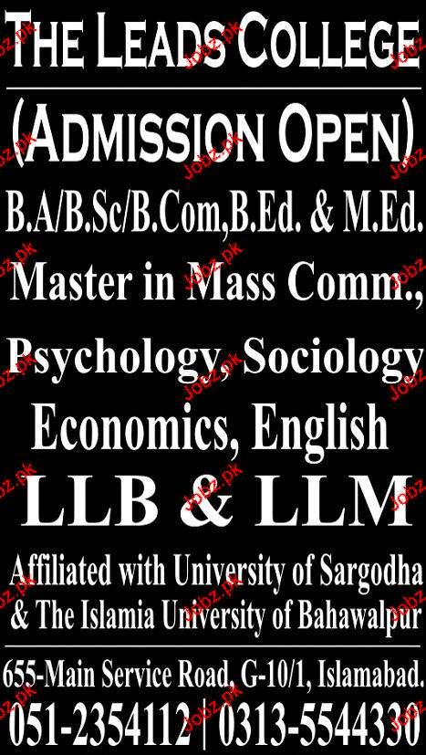The Leads College Admission in BA, BSc, BCom, LLB and LLM in Islamabad Read newspaper ad for exact details.