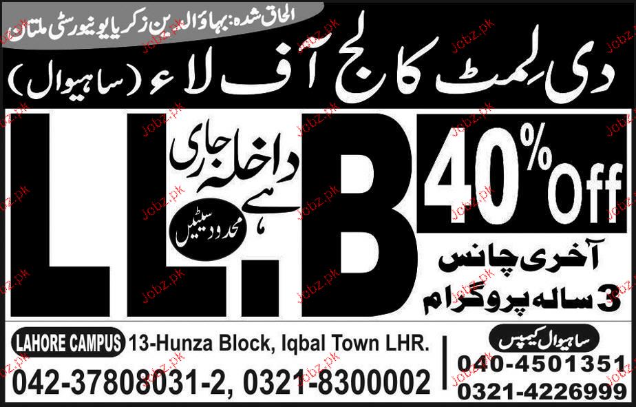 The Limit College of Law Affiliated with the Bahuddin Zakriya University Multan Admission in LLB Three Year Program in Sahiwal. Last Chance of Three Year Program. Read newspaper ad for exact details.