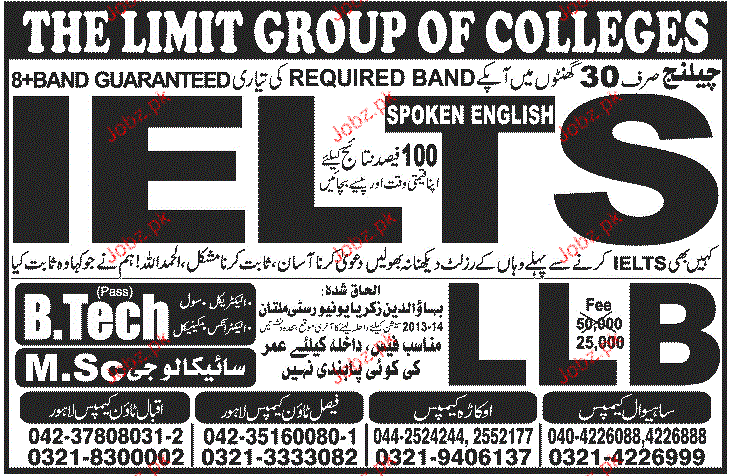 The Limit Group College Admission in IELTS, Btech and LLB in Lahore Read newspaper ad for exact details.