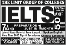 The Limit Group of Colleges Iqbal Town Campus has announced admissions for courses in IELTS, Spoken English and Chinese Language in Lahore Punjab Pakistan 2021. Read newspaper ad for exact details.