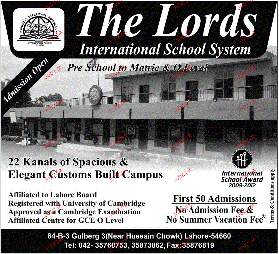 The Lord School International School System Admission in Pre School to Matric in Islamabad Read newspaper ad for exact details.