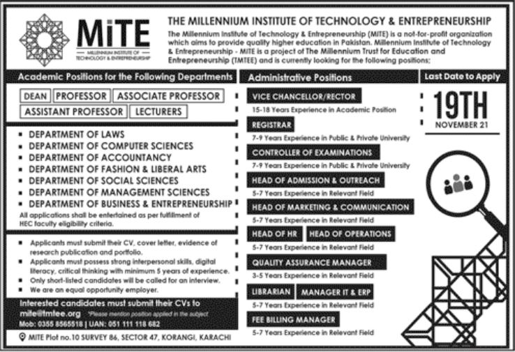 Latest The Millennium Institute of Technology & Entrepreneurship Education Posts Karachi 2025