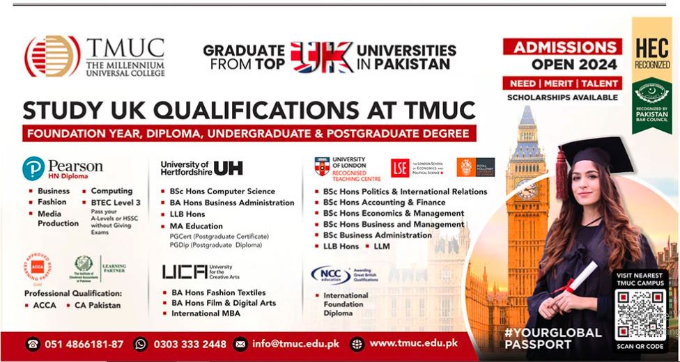 The Millennium Universal College TMUC Foundation Year, Diploma, Undergraduate and Postgraduate Degree admissions 2024 has been started. The Millennium Universal College TMUC Islamabad Islamabad Pakistan welcomes students to apply for admissions in academic year 2024 in Teaching University. Students who want to enroll for academic session 2024 in Diploma, BS, MBA, LLb, MA, BA Hons, Master, CA, BSc Hons, Bachelor, LLM and ACCA qualification and admission criteria for Private institute can apply till last date 10 September 2024. Read newspaper ad for exact details.