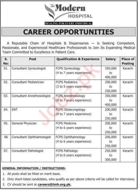 The Modern Hospital is looking for candidates for following posts as per job advertisement published in daily Jang Newspaper of November 16, 2025 for location Karachi, karachi Sindh Pakistan: