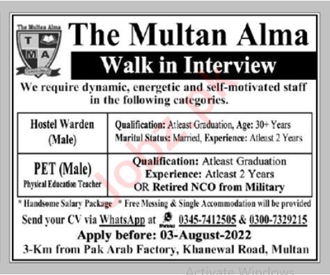 The Multan Alma Multan, multan Punjab Pakistan invites applications from eligible candidates for the post of pet, hostel warden and pet male as per advertisement of July 31, 2022 published in daily Nawaiwaqt Newspaper. Candidates with Bachelor etc. educational background will be preferred.