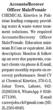 Vacant posts including recovery officer and accounts officer are announced in Chemical Kinetics Pvt Limited Johar Town Lahore, lahore Punjab Pakistan as per 2 June 2025 advertisement in daily The News Newspaper. Candidates with B.com, Others and Bachelor etc. educational background will be preferred.