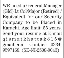 Vacant posts including general manager are announced in Security Company Karachi, karachi Sindh Pakistan as per 11 August 2025 advertisement in daily The News Newspaper. Preferred Education is BA, Others and Bachelor etc.