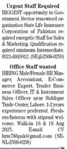 Private Company is looking for candidates for following posts as per job advertisement published in daily The News Newspaper of August 11, 2025 for location Lahore, karachi Punjab Pakistan: