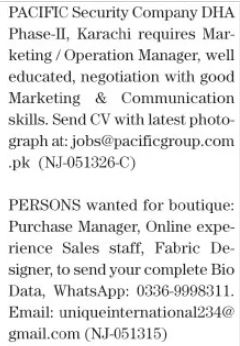 Vacant posts including marketing manager, purchase manager, sales staff, operation manager and fabric designer are announced in Private Company Karachi, karachi Sindh Pakistan as per 11 December 2023 advertisement in daily The News Newspaper. Persons with BBA, Matric, Middle, Intermediate, DAE, BA, Bachelor and B.com etc. education can apply.