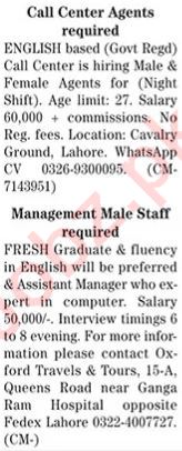 Private Company Lahore, lahore Punjab Pakistan invites applications from eligible candidates for the post of management staff, call center agent and assistant manager as per advertisement of March 11, 2024 published in daily The News Newspaper. Candidates with Bachelor, Intermediate and BA etc. educational background will be preferred.