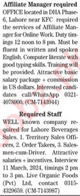 Private Company jobs advertisement dated about 11 March 2024 in daily The News Newspaper invites application for the vacant post of territory sales officer, affiliate manager, salesman, order taker, driver and manager in Lahore, lahore Punjab Pakistan. Persons with Middle, Bachelor, BA, Matric and Intermediate etc. education can apply.