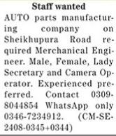 Vacancies in Auto Parts Manufacturing Company Advertisement August 2024