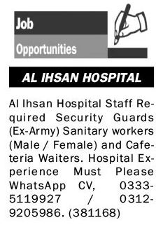 Al Ihsan Hospital latest Classifieds Medical jobs and others can be applied till March 24, 2024 or as per closing date in newspaper ad. Read complete ad online to know how to apply on latest Al Ihsan Hospital job opportunities.