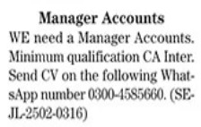 Accountancy Firm jobs advertisement dated about 12 May 2025 in daily The News Newspaper invites application for the vacant post of accountant and manager accounts in Lahore, lahore Punjab Pakistan. Preferred Education is CA and Others etc.