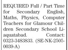 Glamour Children Secondary School jobs advertisement dated about 12 May 2025 in daily The News Newspaper invites application for the vacant post of computer teacher, physics teacher, maths teacher, english teacher and teacher in Liaquatabad Karachi, karachi Sindh Pakistan. Persons with Bachelor, Master, M.sc and MA etc. education can apply.