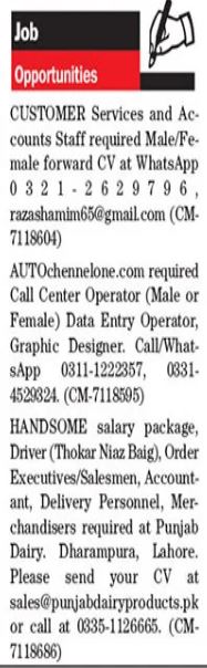 Vacant posts including merchandiser, call center operator, order executive, ltv driver, data entry operator, customer service representative, graphic designer, accountant, driver, salesman, delivery personnel and accounts staff are announced in Private Company Lahore, lahore Punjab Pakistan as per 13 June 2022 advertisement in daily The News Newspaper. Persons with Middle, Intermediate, Bachelor and Matric etc. education can apply.