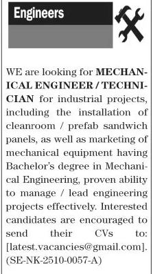 Factory jobs advertisement dated about 13 October 2025 in daily The News Newspaper invites application for the vacant post of engineer, mechanical technician and mechanical engineer in Karachi, karachi Sindh Pakistan. Preferred Education is Bachelor and B.E etc.