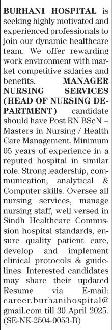 Latest Classifieds jobs in Burhani Hospital in Medical and others can be applied till 30 April 2025 or as per closing date in newspaper ad. Read complete ad online to know how to apply on latest Burhani Hospital job opportunities.