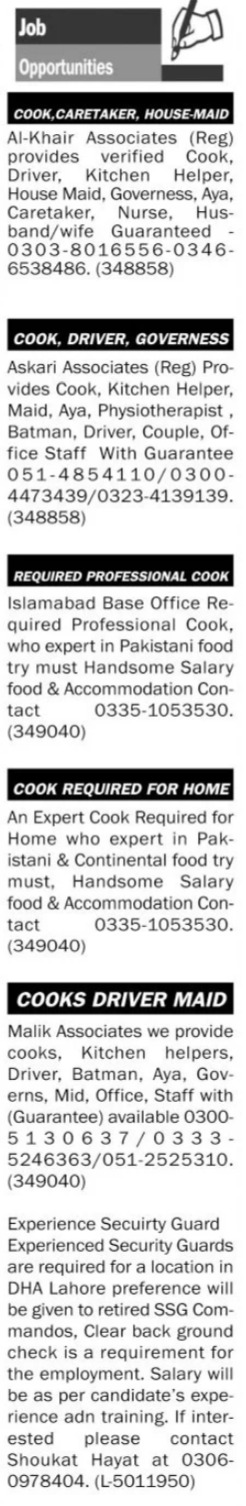 Vacant posts including caretaker, aya, batman, chef, nurse, husband wife, security guard, cook, physiotherpist, governess, kitchen helper, house maid, driver, office staff and ltv driver are announced in House Islamabad, Lahore and Islamabad Pakistan as per 13 February 2022 advertisement in daily The News Newspaper. Matric, Bachelor, Middle and Primary etc. educational qualification will be preferred.