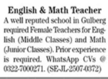 Vacant posts including teacher, english teacher and math teacher are announced in Private School Gulberg Lahore, lahore Punjab Pakistan as per 14 July 2025 advertisement in daily The News Newspaper. Candidates with Master and Bachelor etc. educational background will be preferred.